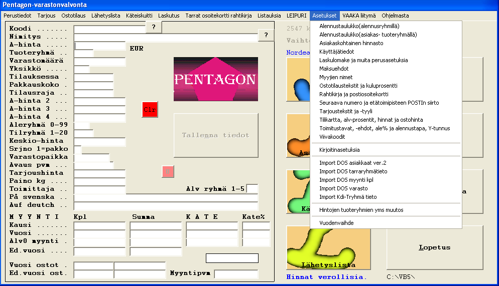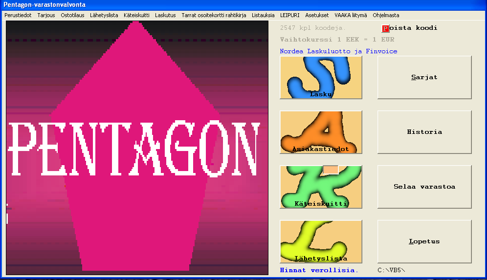 Pentagon Varasto kokeiluohjelman verollinen hinta on 49.95 EUR. Saat sähköpostin tilauksestasi jossa on pankkitilini. Maksettuasi tilauksesi lähetän sinulle postitse asennusohjeet ja asennus CD:n. Ohjelmisto sisältää kaikki toiminnat mutta käyttäjänimenä on Pentagon Kokeilu Oy. Jos tilaat varsinaisen laskutusohjelmiston hyvitän sen yhteydessä kokeiluohjelman hinnan.