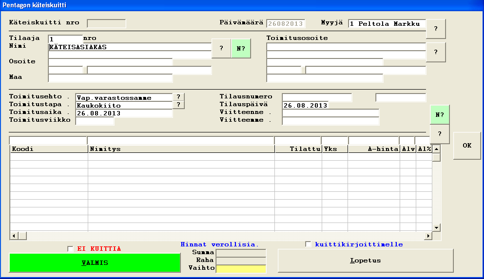 Saat sähköpostin tilauksestasi jossa on pankkitilini. Maksettuasi tilauksesi lähetän sinulle postitse asennusohjeet ja asennus CD:n. Ohjelmisto sisältää kaikki toiminnat mutta käyttäjänimenä on Pentagon Kokeilu Oy. Jos tilaat varsinaisen laskutusohjelmiston hyvitän sen yhteydessä kokeiluohjelman hinnan. Kiitoksia tilauksestasi!